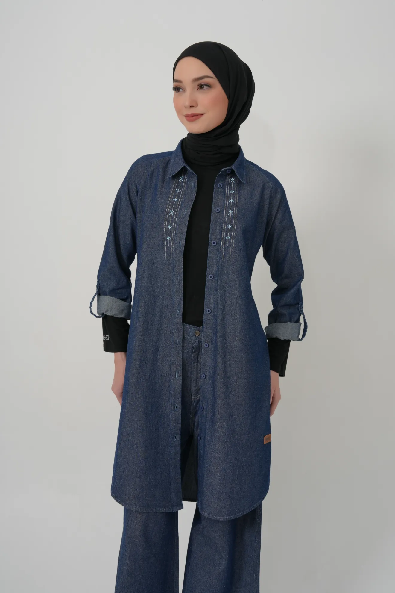 Potongan A-line dengan siluet panjang ini mendukung tampilan modest yang tetap nyaman. Detail bordir vertikal di bagian depan menambah kesan feminin yang simpel, cocok untuk kamu yang suka gaya simpel tapi tetap berkarakter.