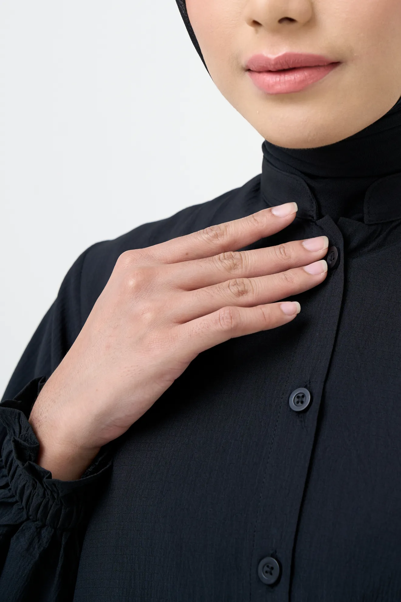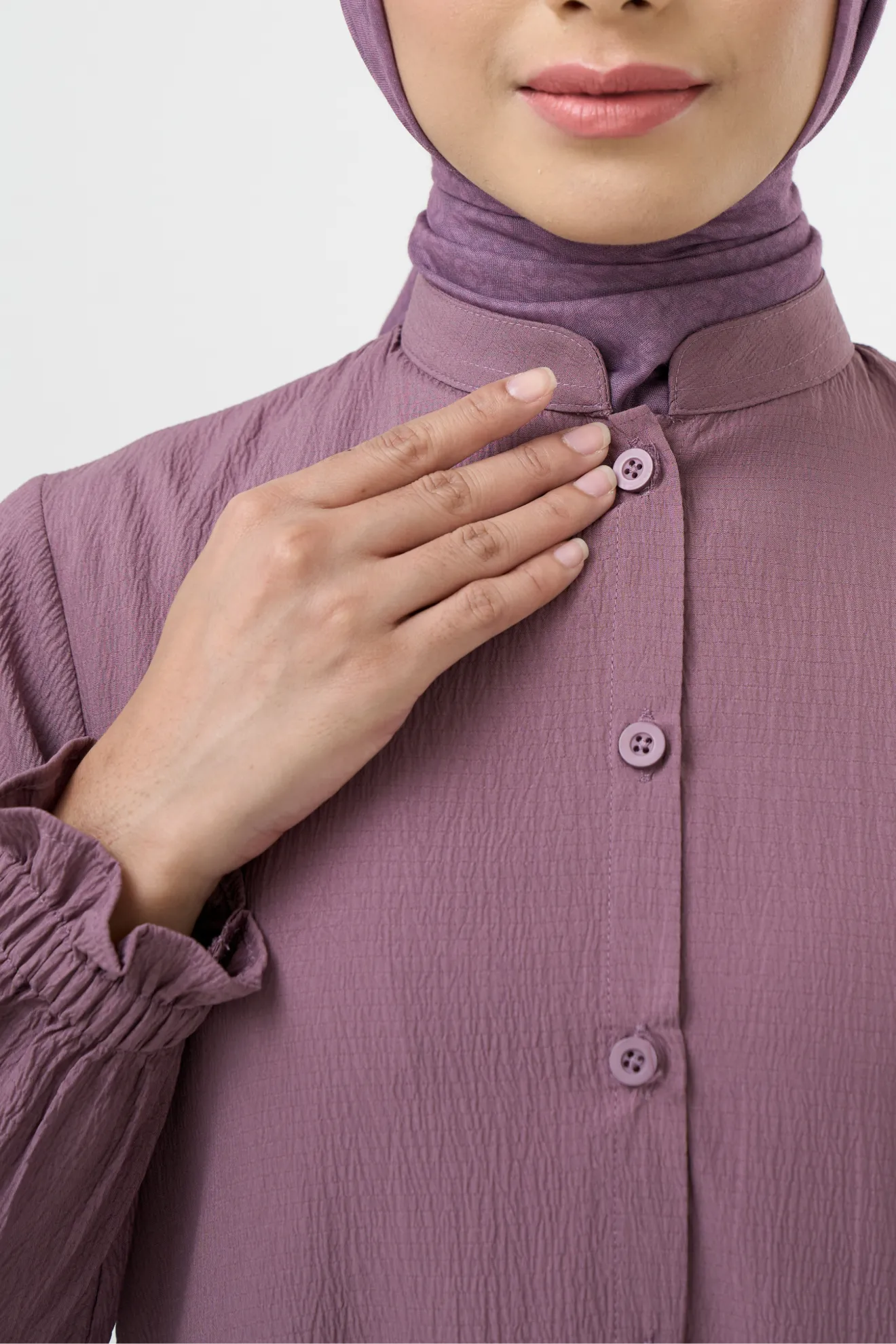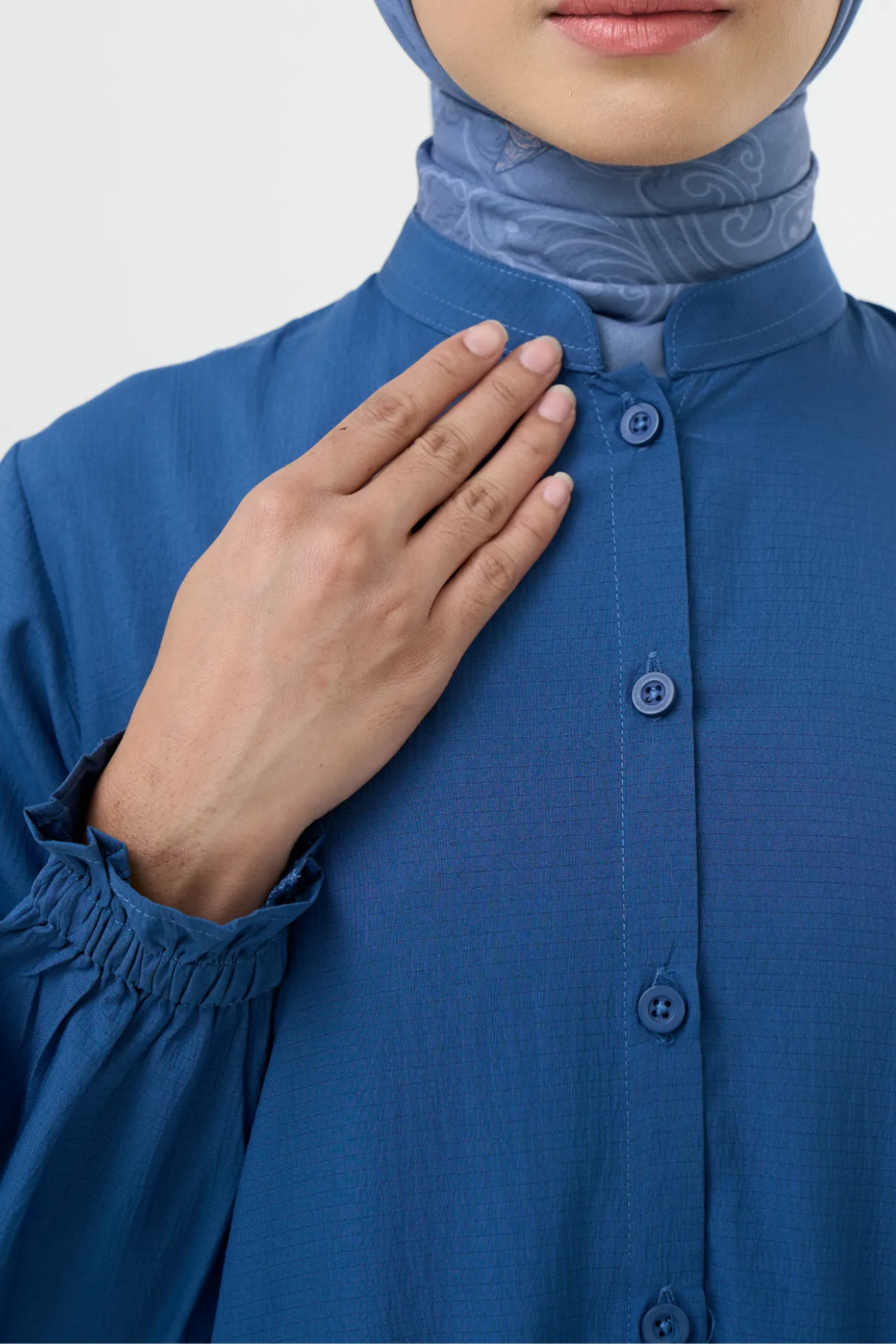 Kerah ShanghaiFull Kancing Hingga Bawah (Styling Long Outer) Kerah ShanghaiLengan Variasi Frill Karet Detail Lipit Kipas di Sisi Bawah