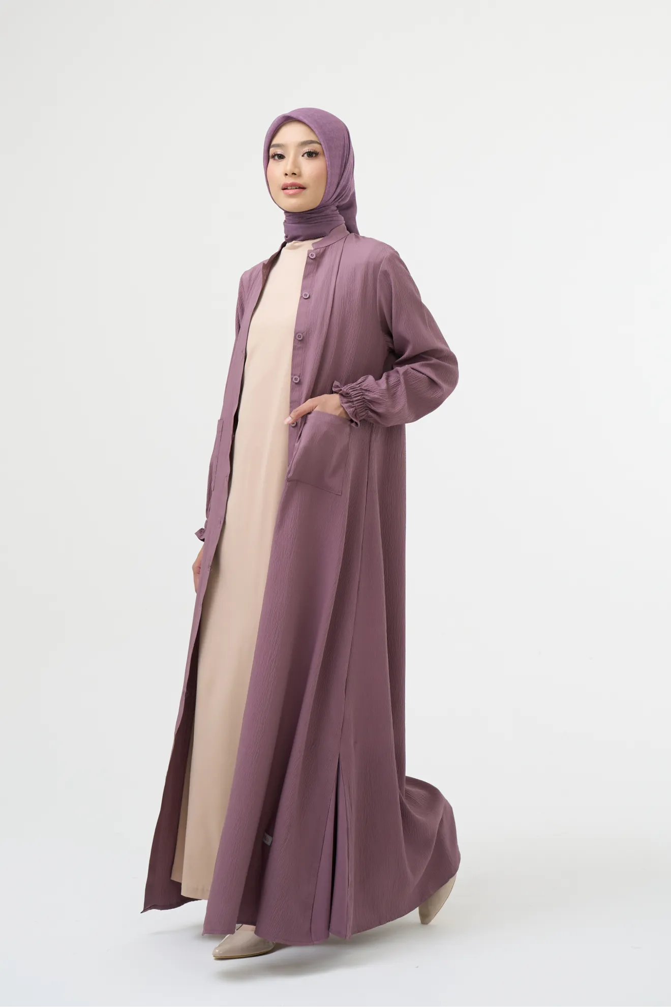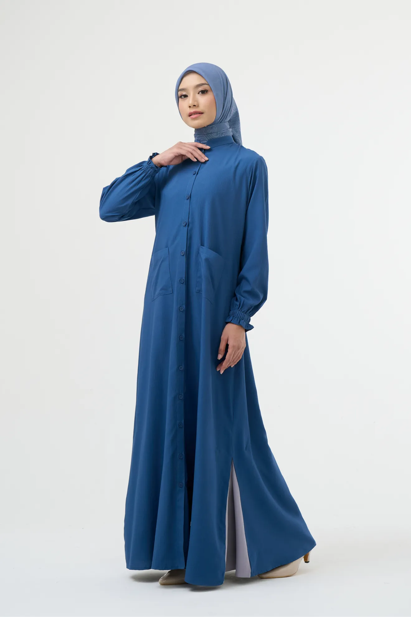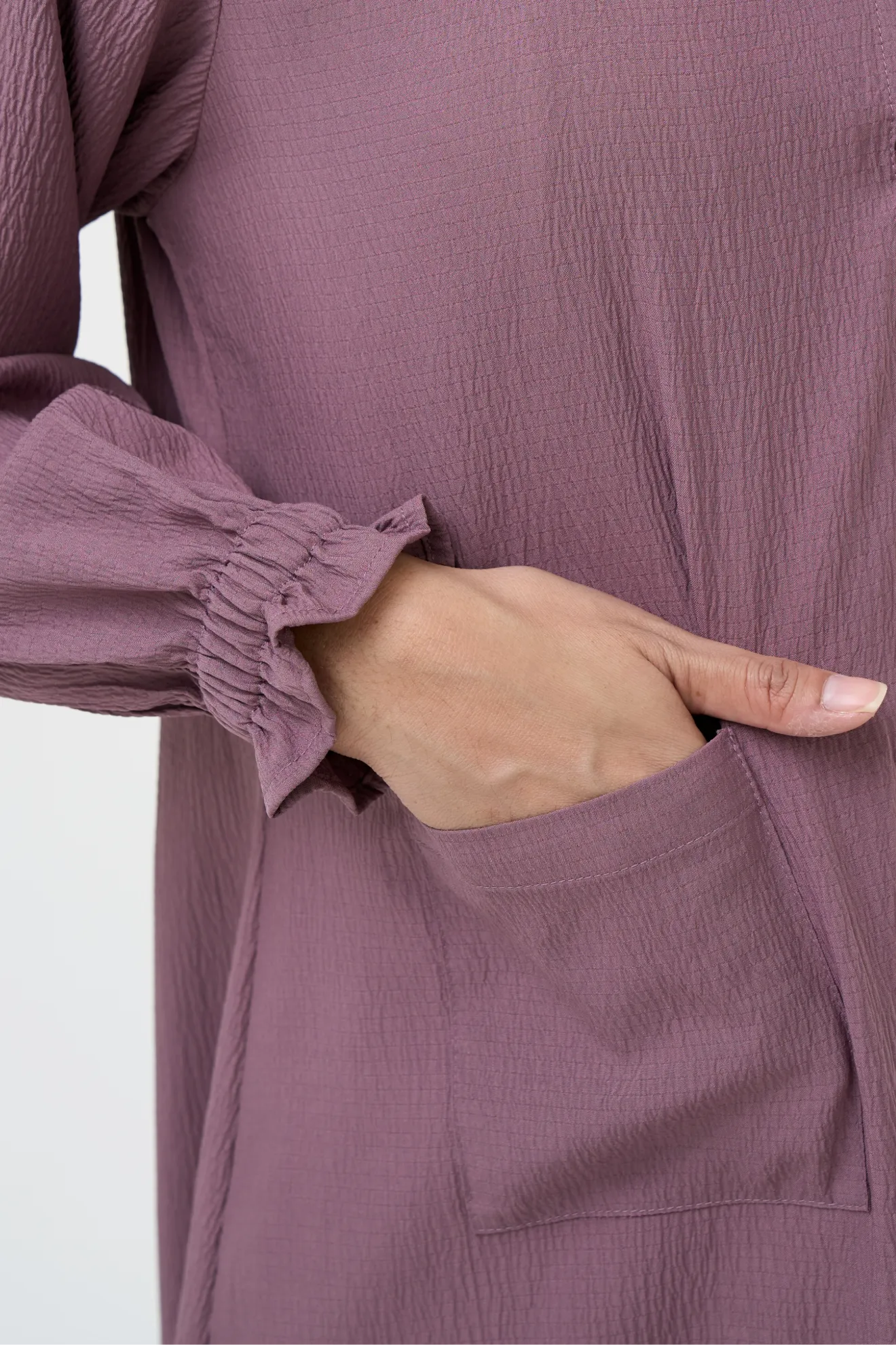 Kerah ShanghaiFull Kancing Hingga Bawah (Styling Long Outer) Kerah ShanghaiLengan Variasi Frill Karet Detail Lipit Kipas di Sisi Bawah