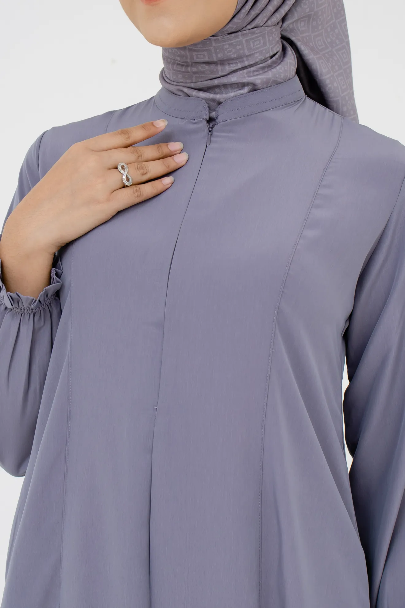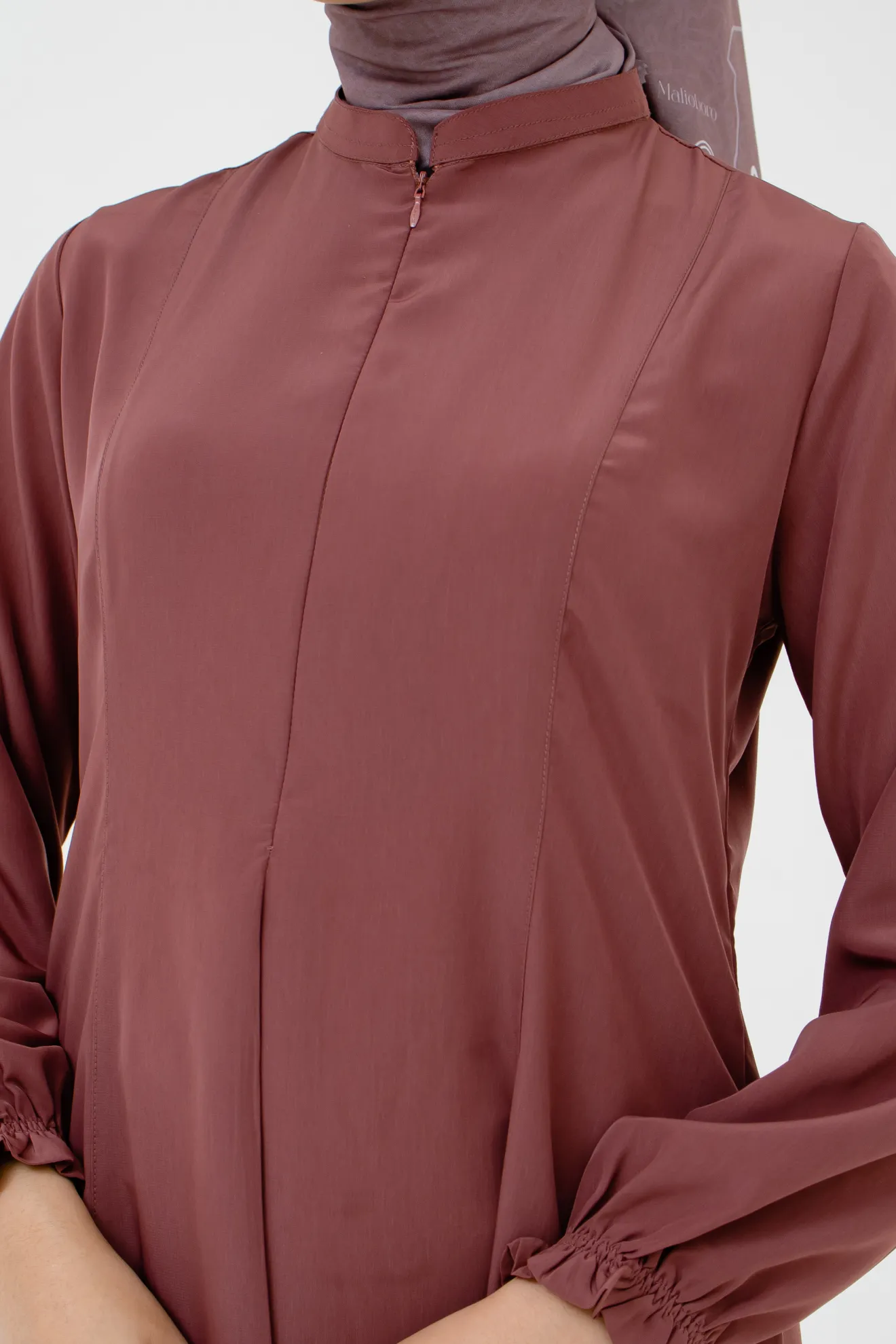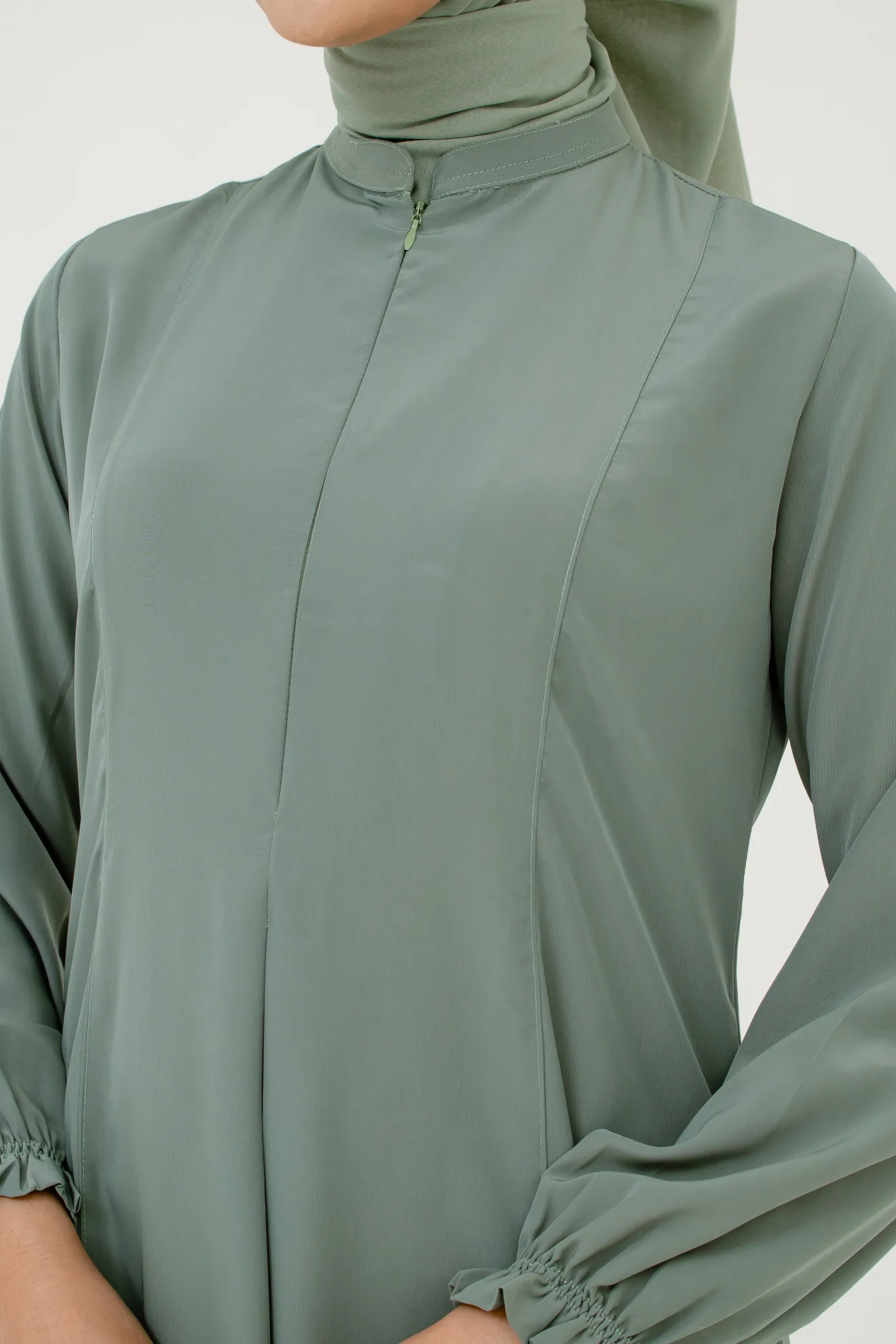 Kerah ShanghaiZipper Depan Lengan Variasi Kerut Lipit Hadap Saku Sisi Potongan Slim Fit