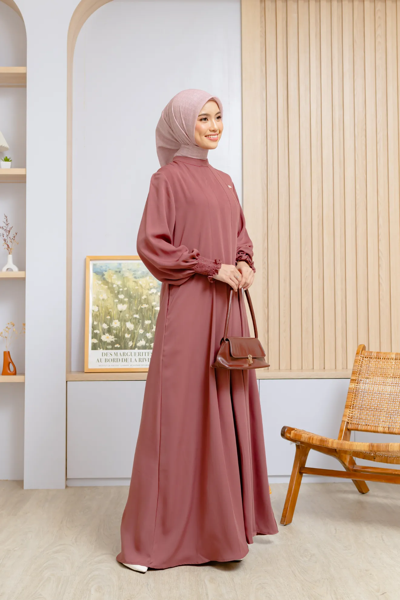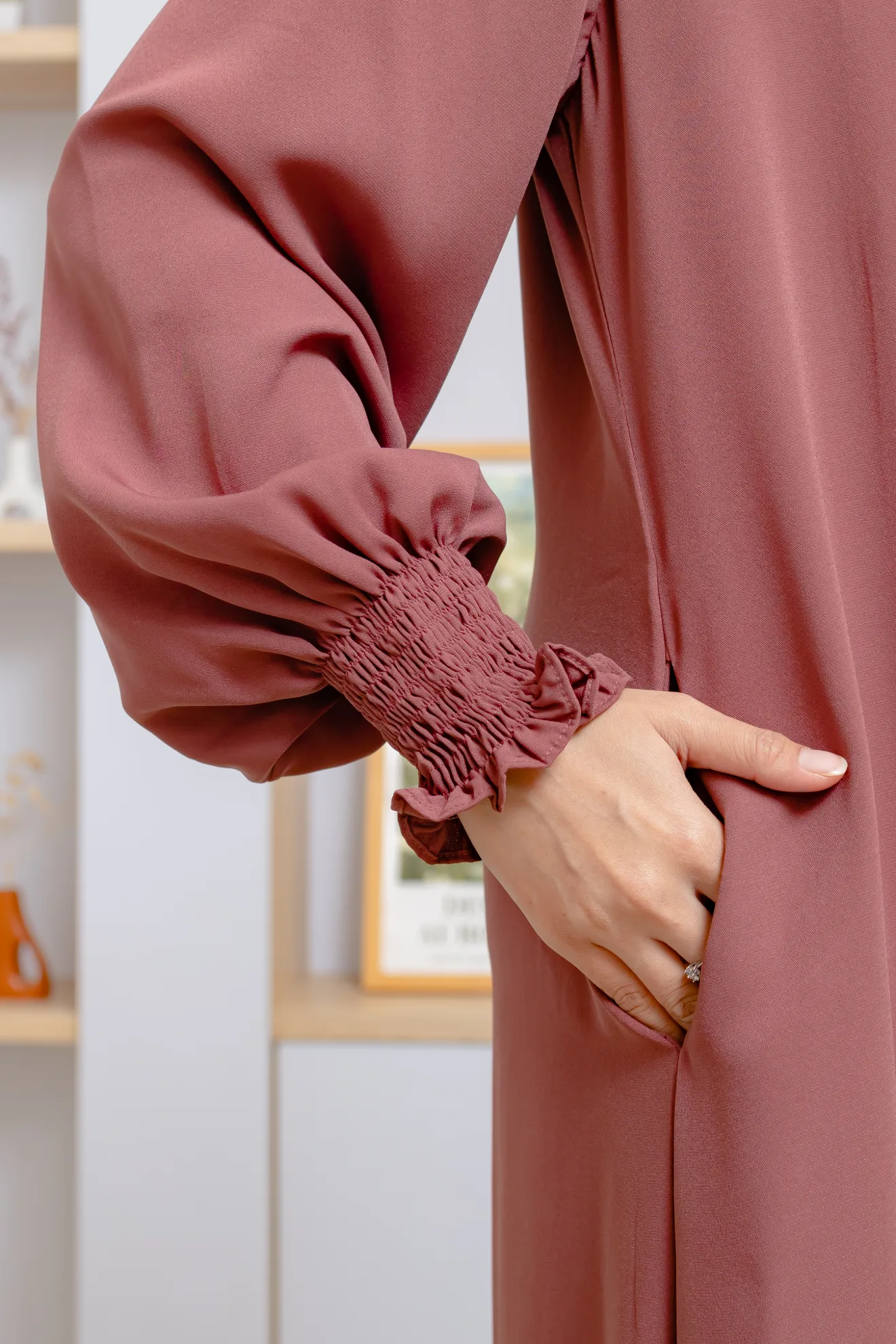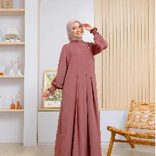 Variasi lipit di bagian depan menjadi detail yang mempertegas kesan anggun sekaligus clean pada gamis ini. Kerah shanghai memberikan sentuhan modern yang tetap sopan, sementara detail smock pada lengan menambahkan tekstur yang manis tanpa mengurangi kenyamanan. Resleting belakang memudahkan pemakaian, dan saku samping siap menunjang aktivitas harian dengan praktis.