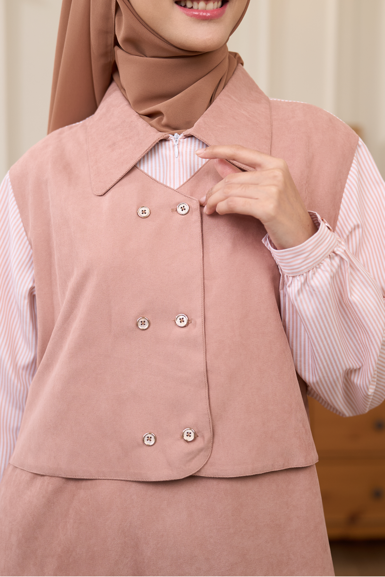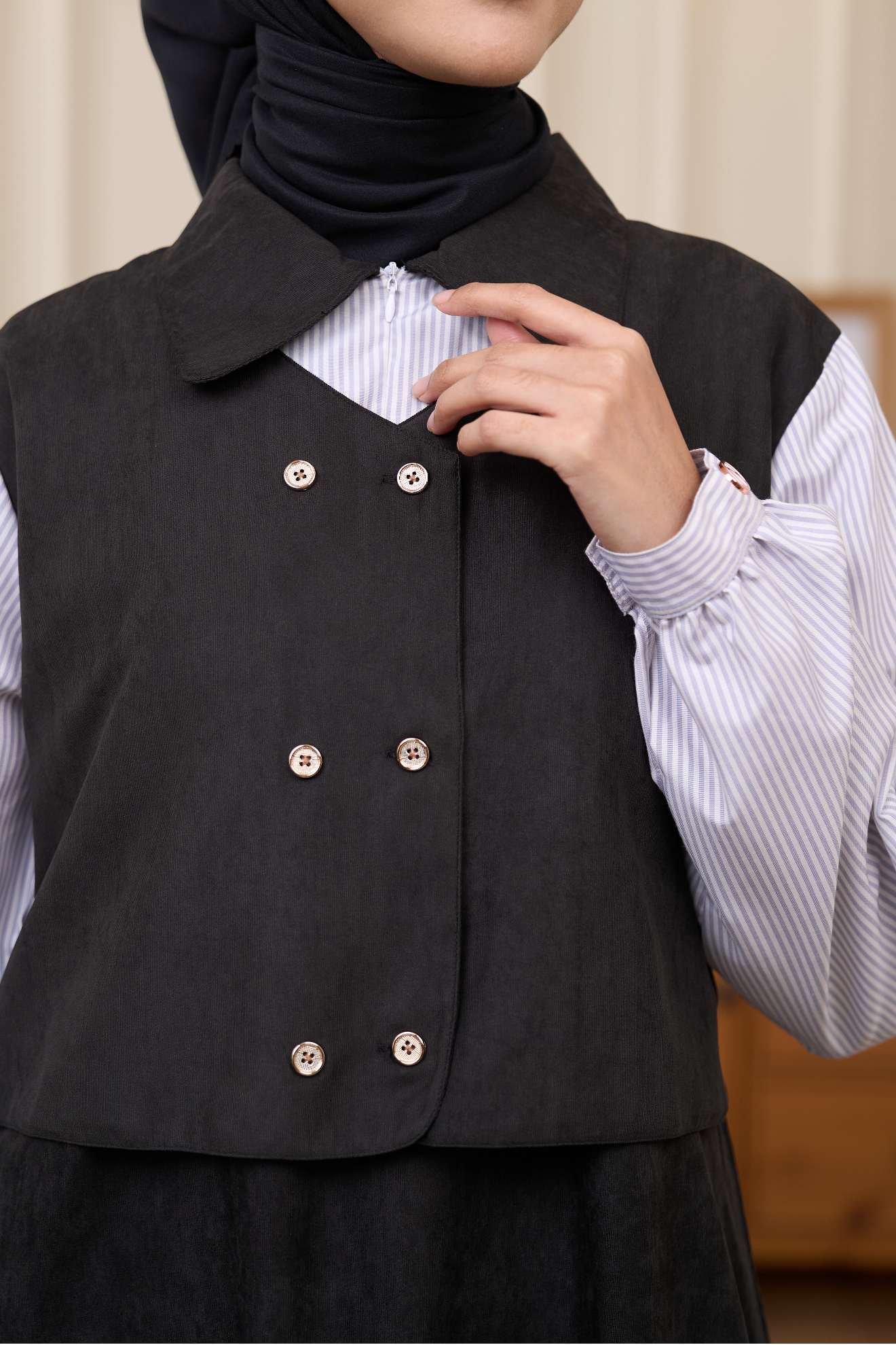 SVASANA 003 menggabungkan Roseti Mix Saluria yang ringan dan elegan, memberi kenyamanan dan tampilan stylish yang pas untuk liburanmu. Desain kerah kemeja yang tegas dipadu dengan model vest yang playful, menciptakan tampilan yang rapi namun tetap santai.