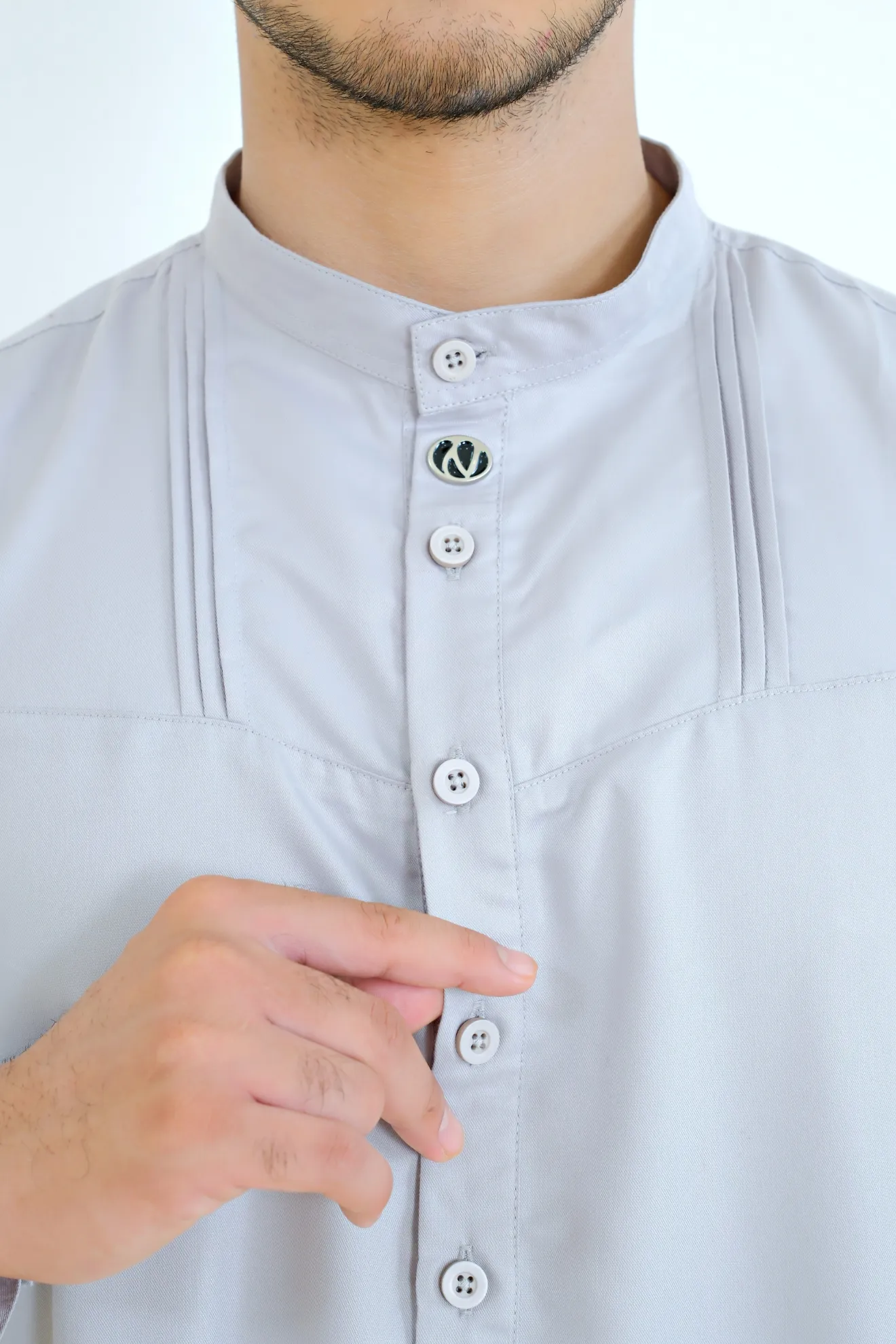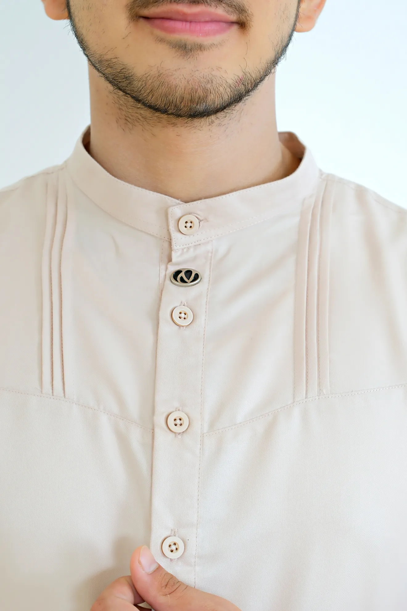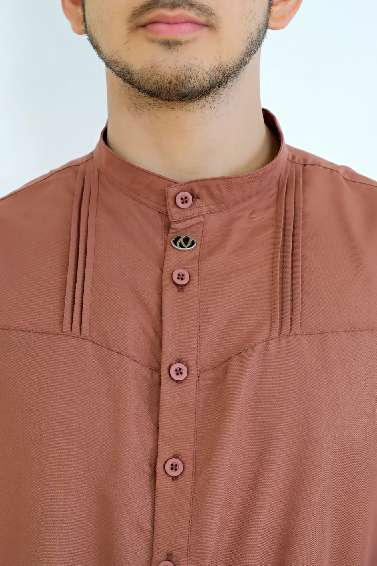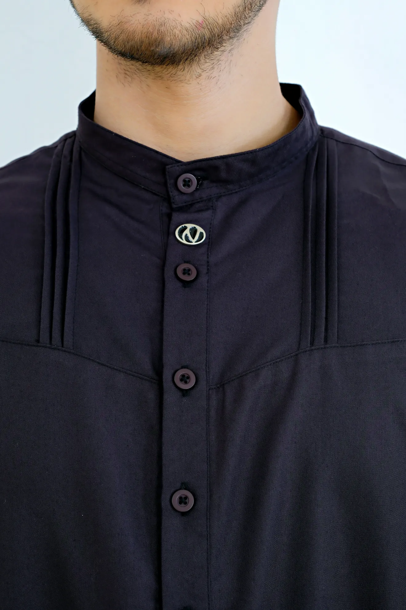 Kerah ShanghaiLengan Manset Kancing Saku SisiVariasi Opnaisel Bukaan Depan Kancing