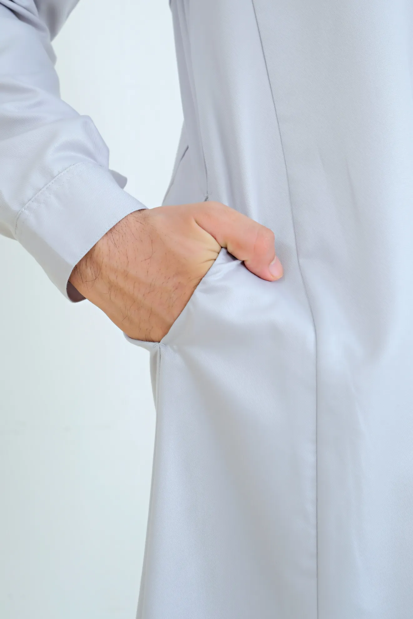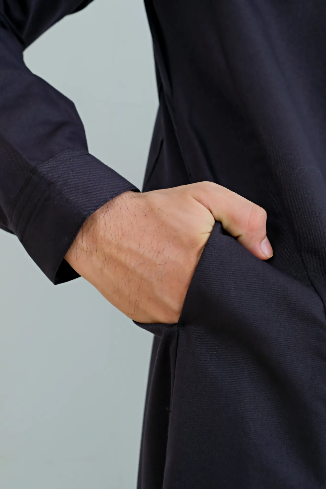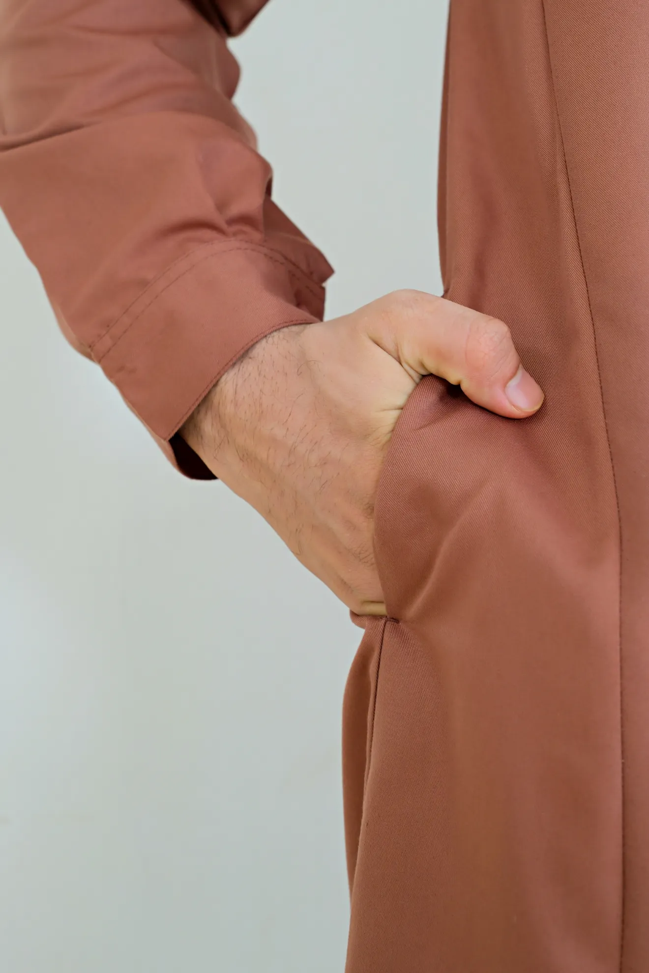 Kerah ShanghaiLengan Manset Kancing Saku SisiVariasi Opnaisel Bukaan Depan Kancing