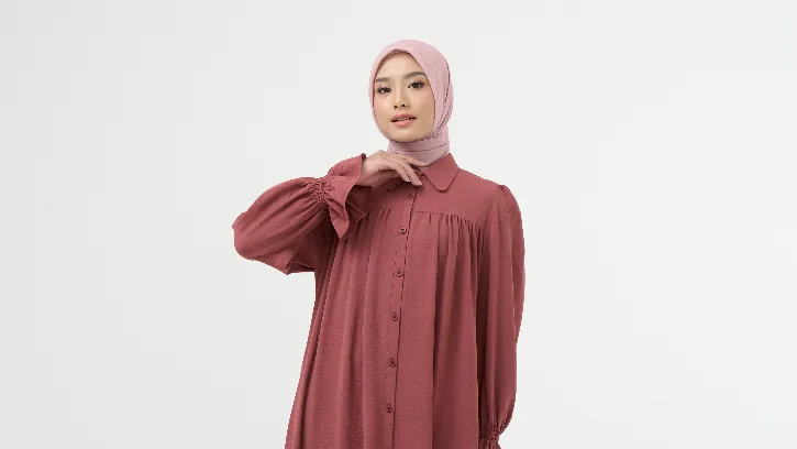 Yang serunya, gamis ini bisa dipakai sebagai long outer atau dress karena kancing hidupnya penuh sampai bagian bawah. Detail lipit kipas di sisi bawah menambah sentuhan visual halus yang tetap memikat saat melangkah.