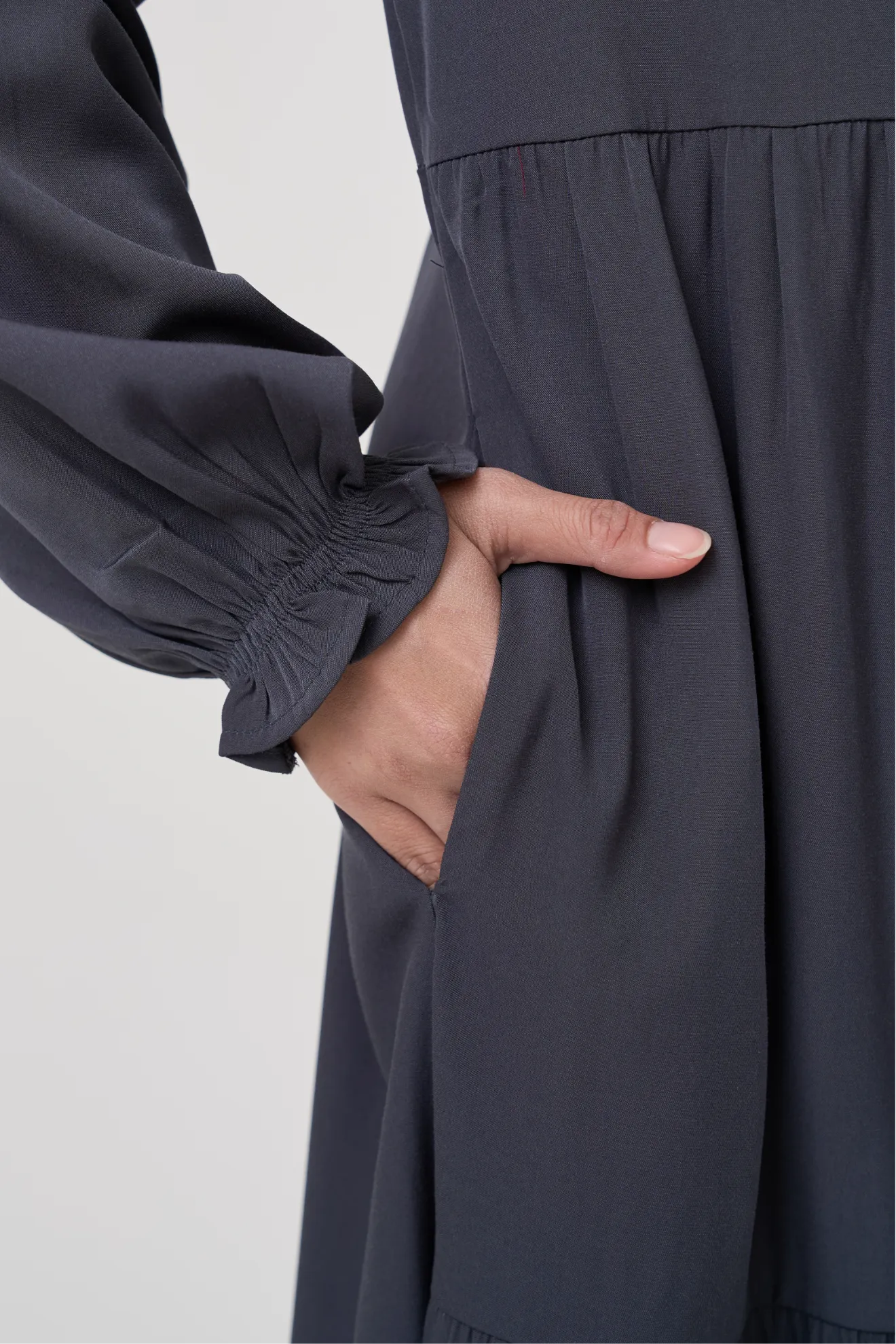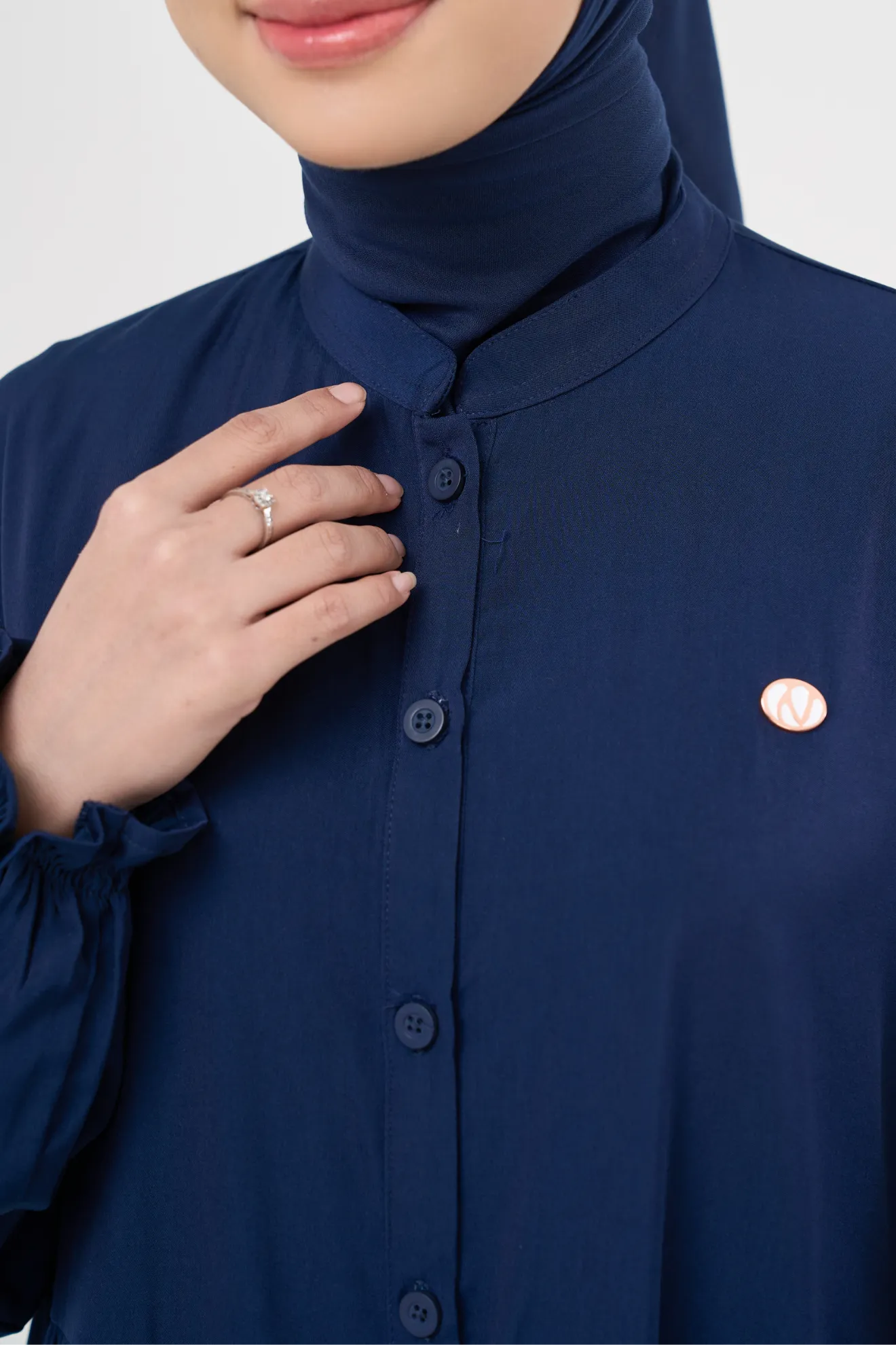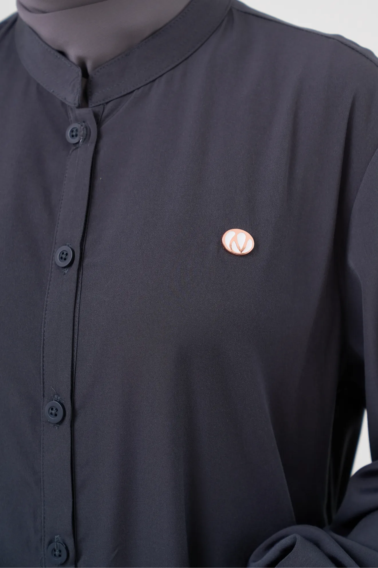 Kerah Shanghai Bukaan Depan KancingKancing Aktif Hingga PinggangSaku Sisi Lengan Smock Karet