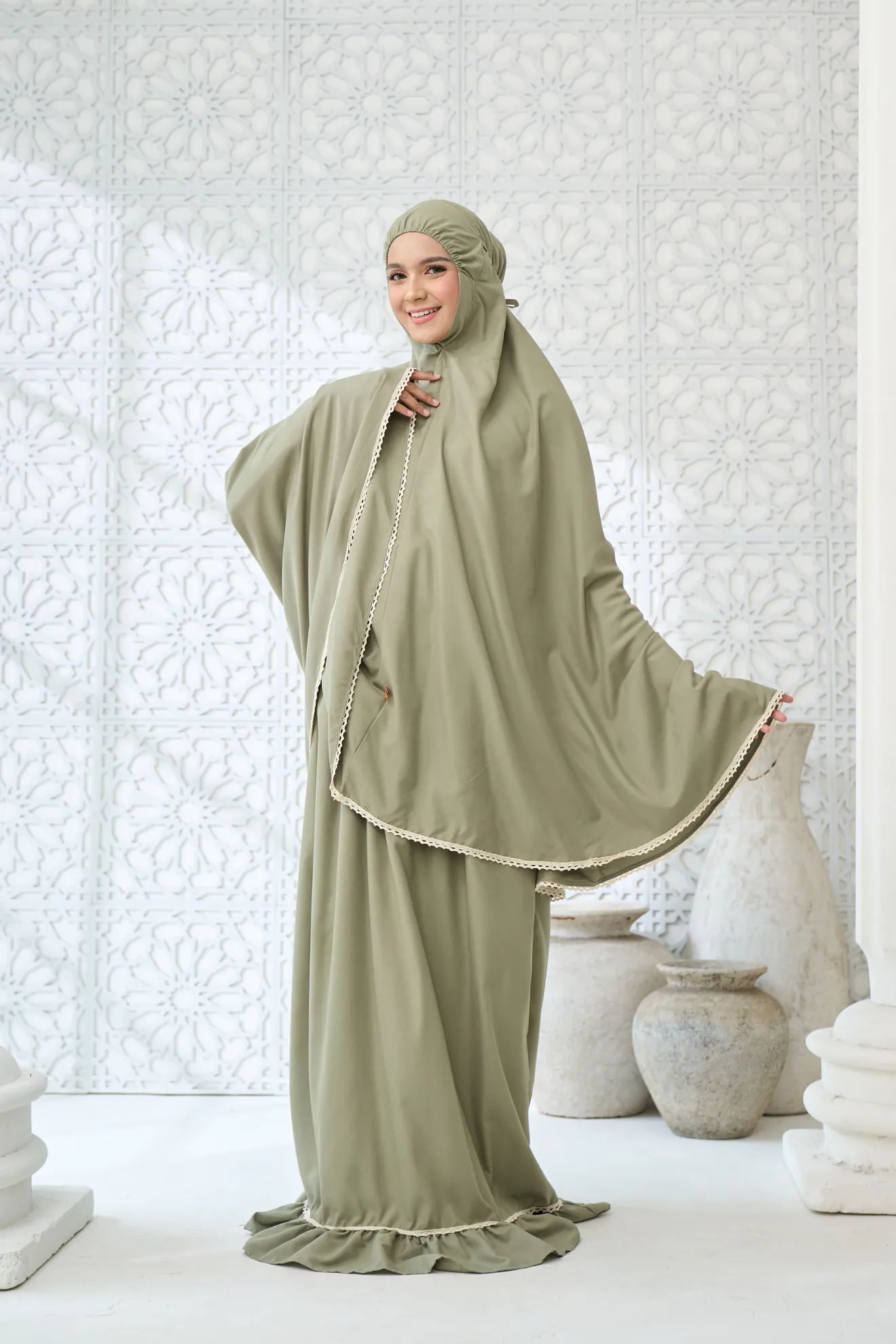 Dilengkapi dengan tali yang praktis, pouch zipper untuk penyimpanan lebih rapi, serta pad karet yang memastikan mukena tetap pas di wajah. Sentuhan renda di tepiannya menambah kesan manis, sementara rok dengan frill memberikan tampilan yang lebih anggun. Prayer Set 01 adalah pilihan sempurna buat kamu yang ingin tampil rapi dan elegan saat beribadah.