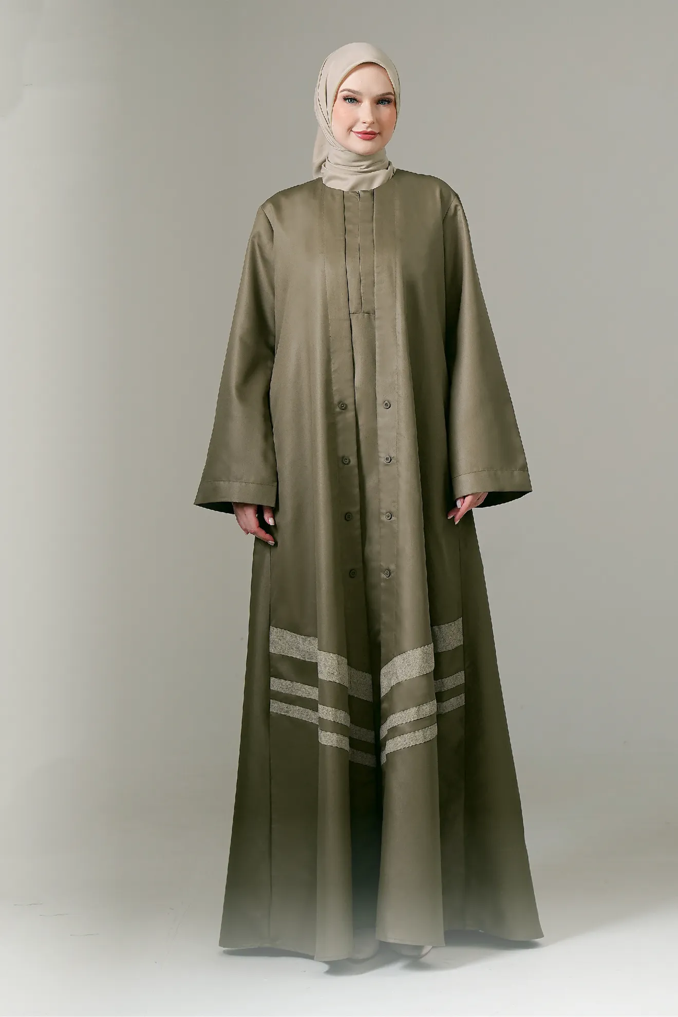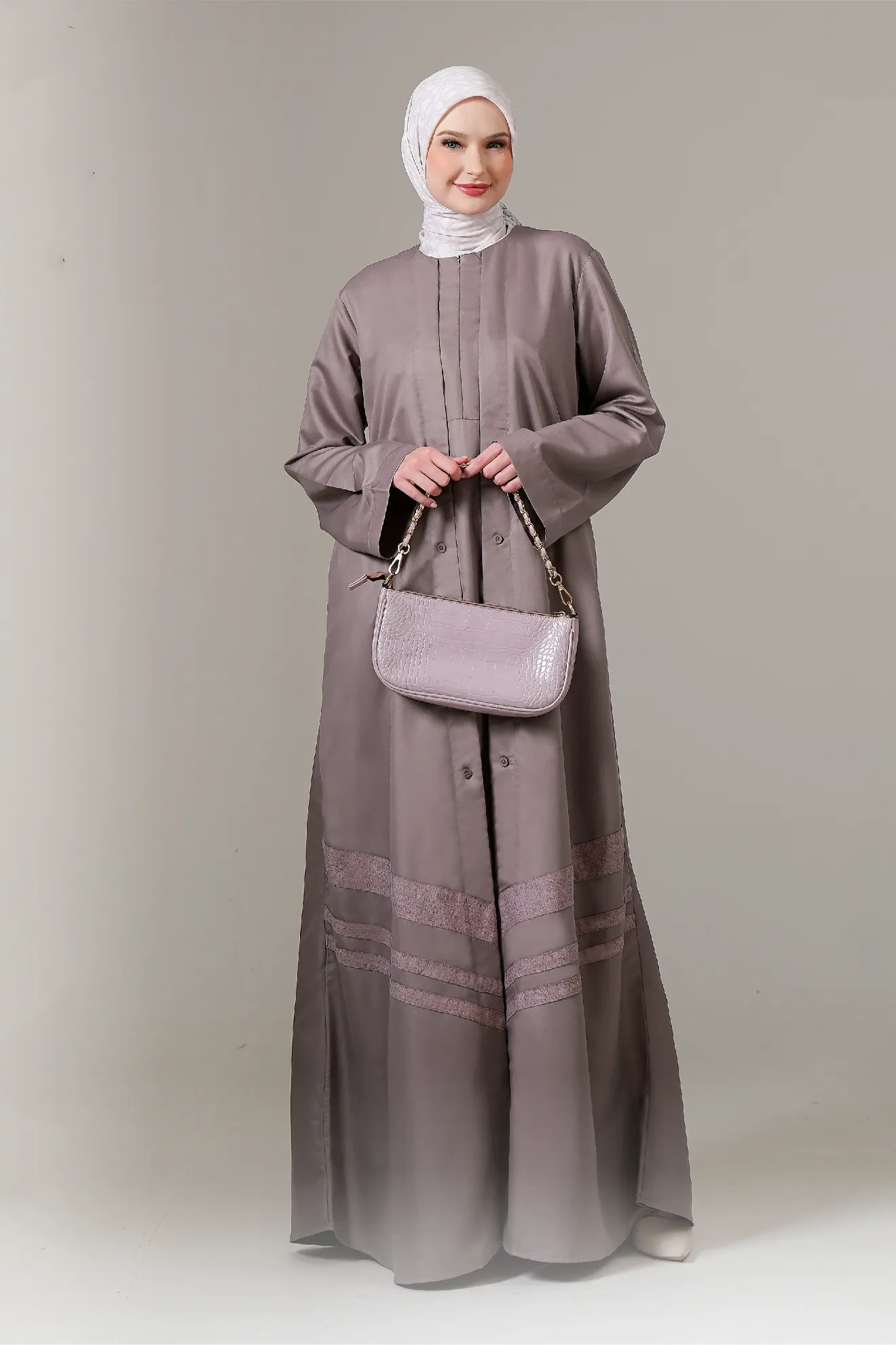 Hadir dalam dua warna kekinian yaitu Olive, Lilac, dan Grey. Dengan sentuhan list dan lengan abaya yang manis bikin look jadi pusat perhatian!