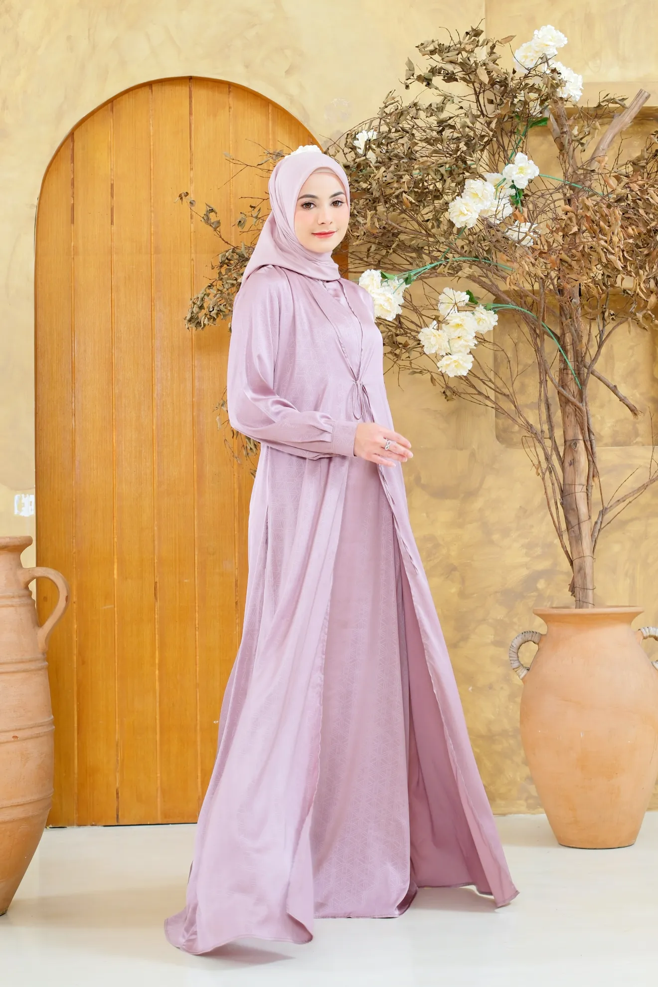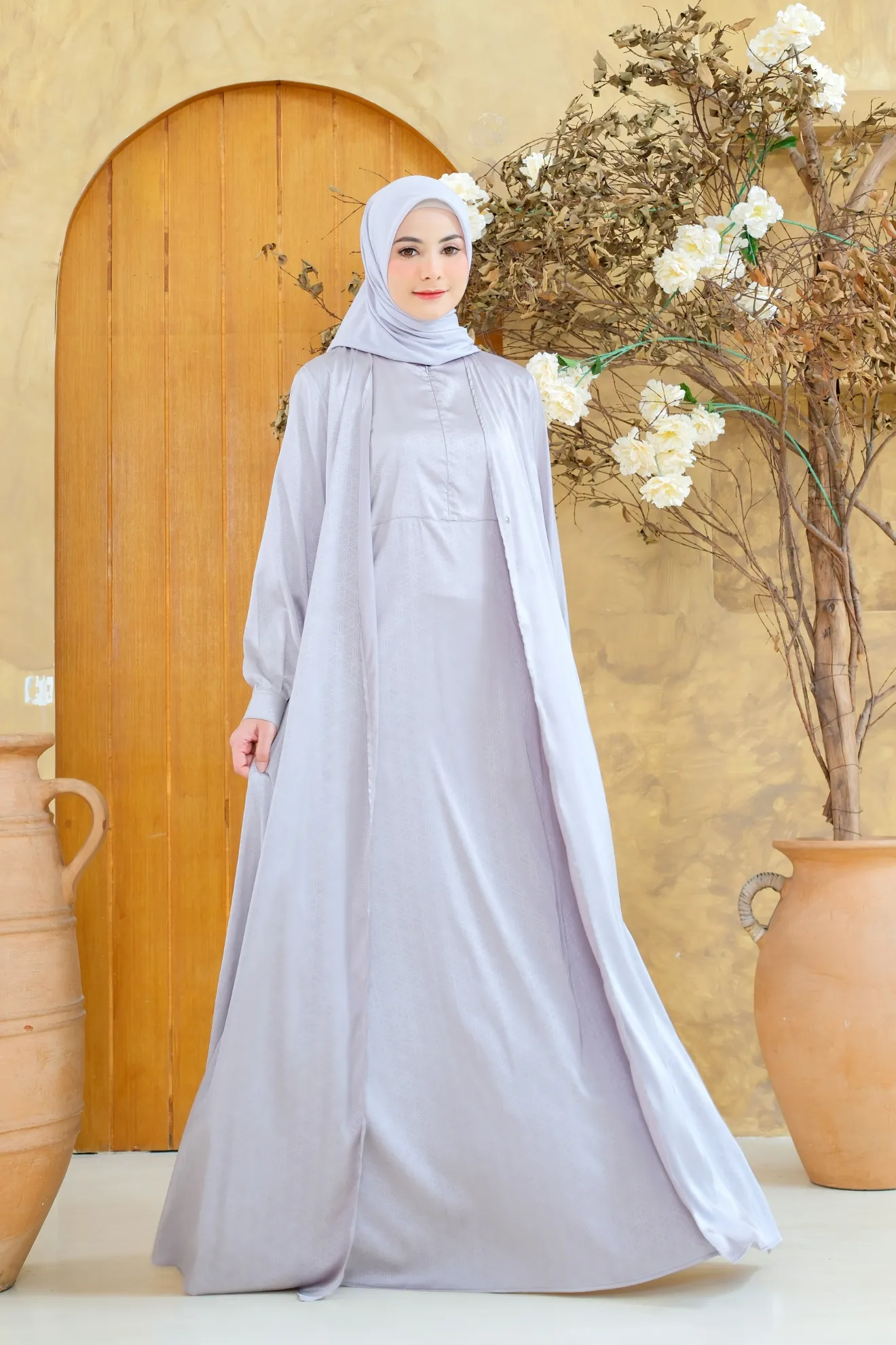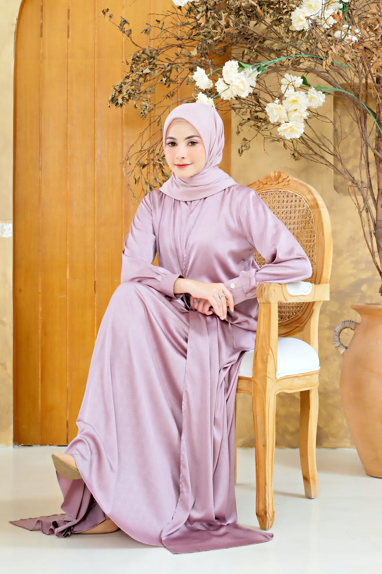 RON 047 adalah gamis dengan sentuhan mewah dan elegan berkat material Satin Emboss. Kain ini memiliki tekstur timbul yang unik, hasil dari teknik bordir mesin jacquard, memberikan motif yang terlihat lebih hidup dan berkelas. Perpaduan serat rayon, katun, wol, dan poliester membuat bahan ini terasa lembut, sejuk di kulit, dan memiliki kilau indah yang menambah kesan eksklusif.