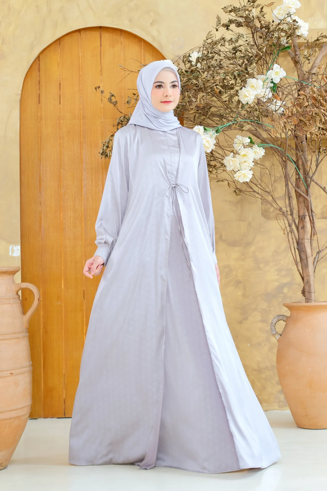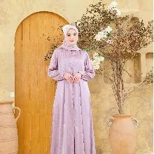 Desainnya dilengkapi dengan kerah shanghai yang menambah tampilan anggun. Busui friendly untuk kenyamanan ibu menyusui, serta lengan manset dengan kancing yang praktis dan memudahkan saat berwudhu. Saku di sisi memberikan kemudahan membawa barang kecil, dan variasi tali pita di bagian depan menambah aksen manis dan feminin.