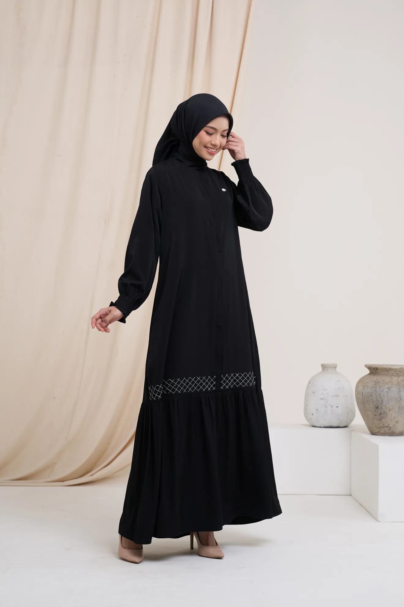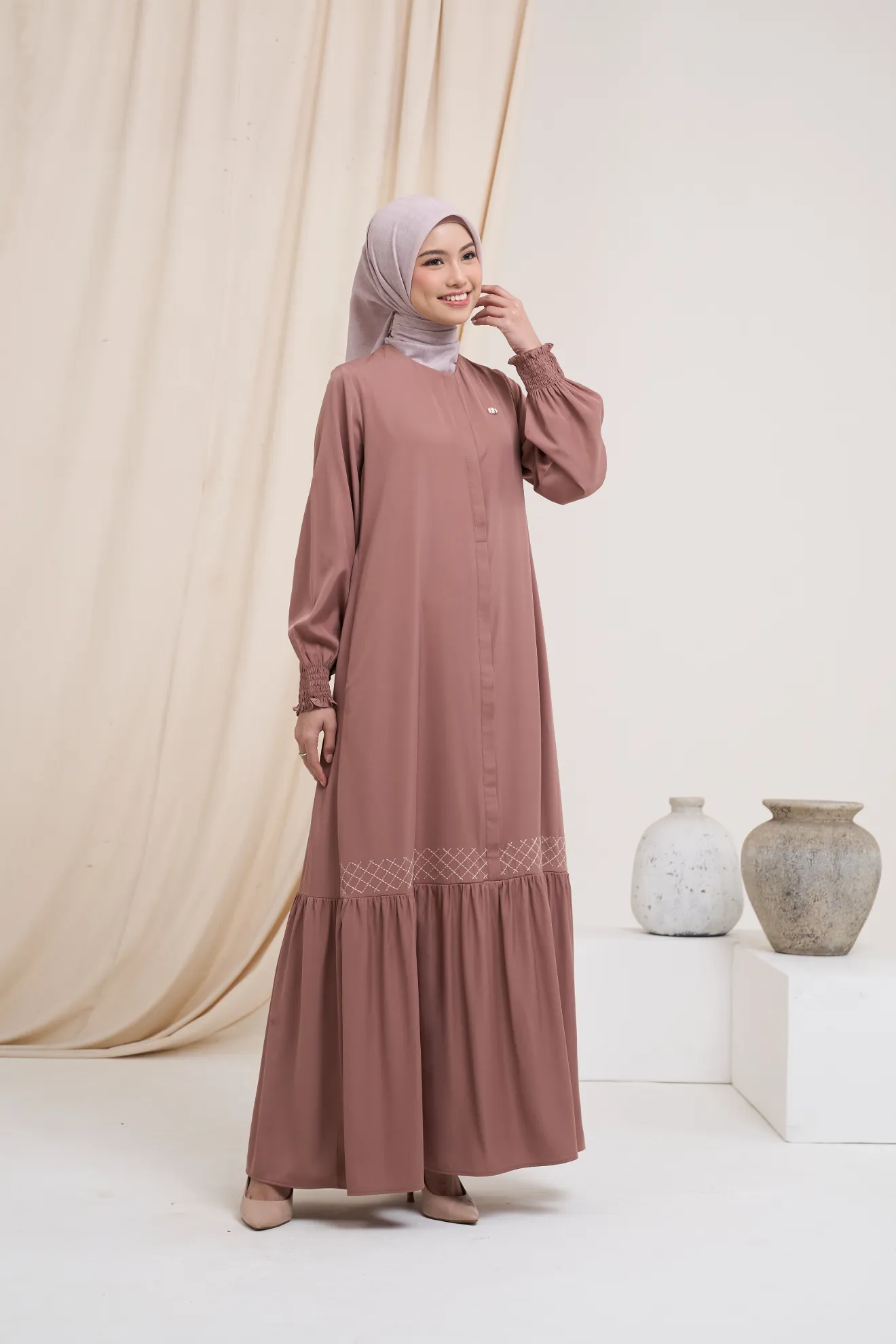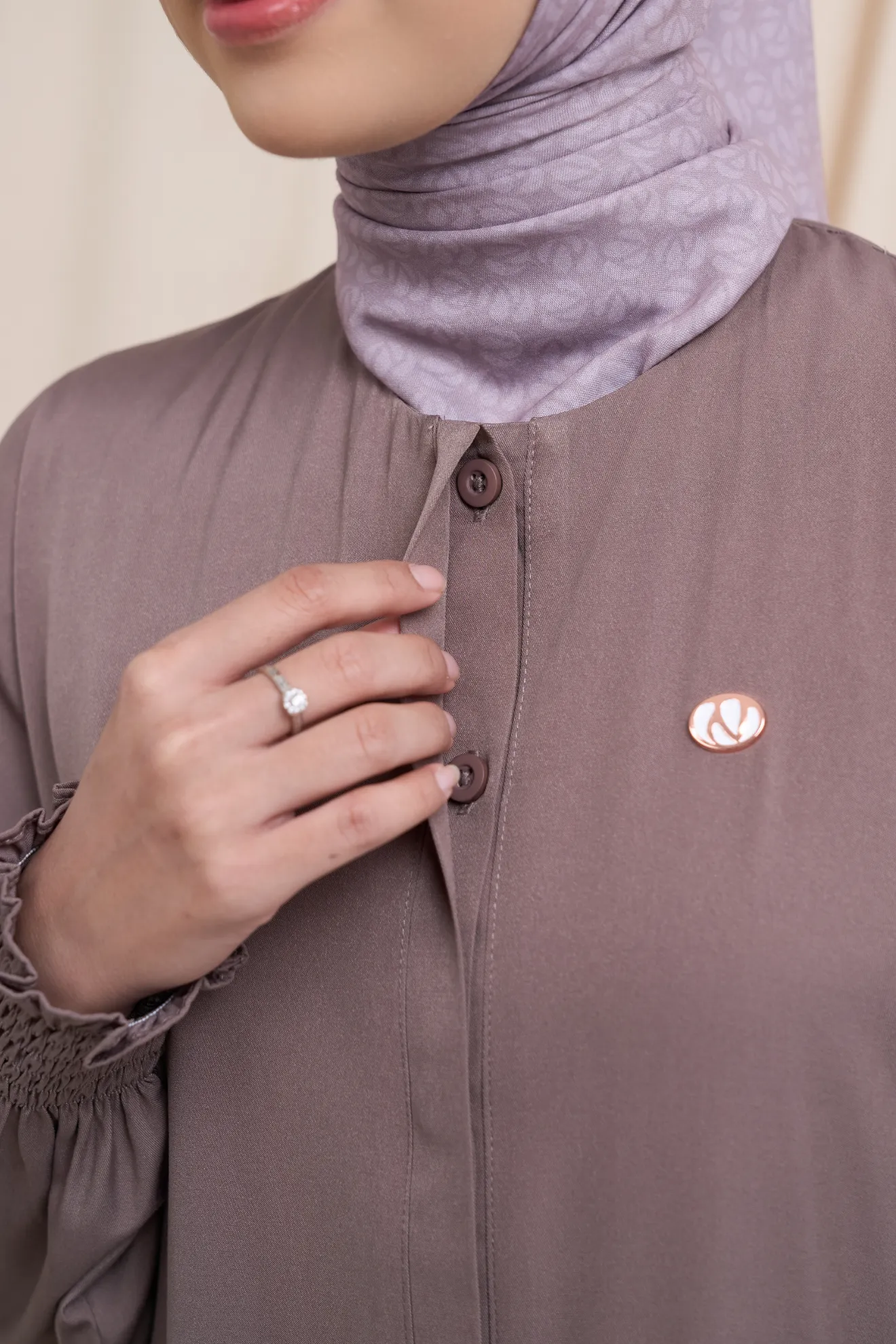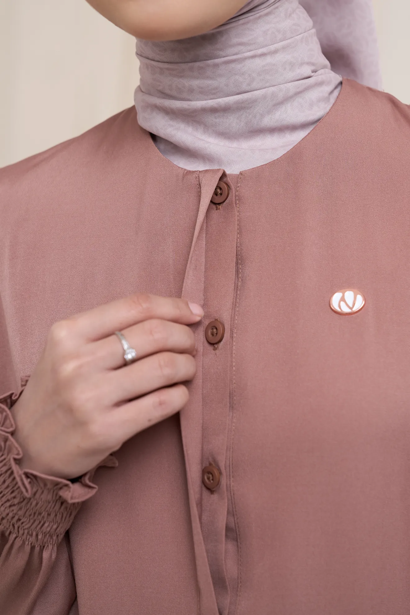 Kancing Depan Tersembunyi Variasi Kerut Variasi Bordir Lengan Karet Smock