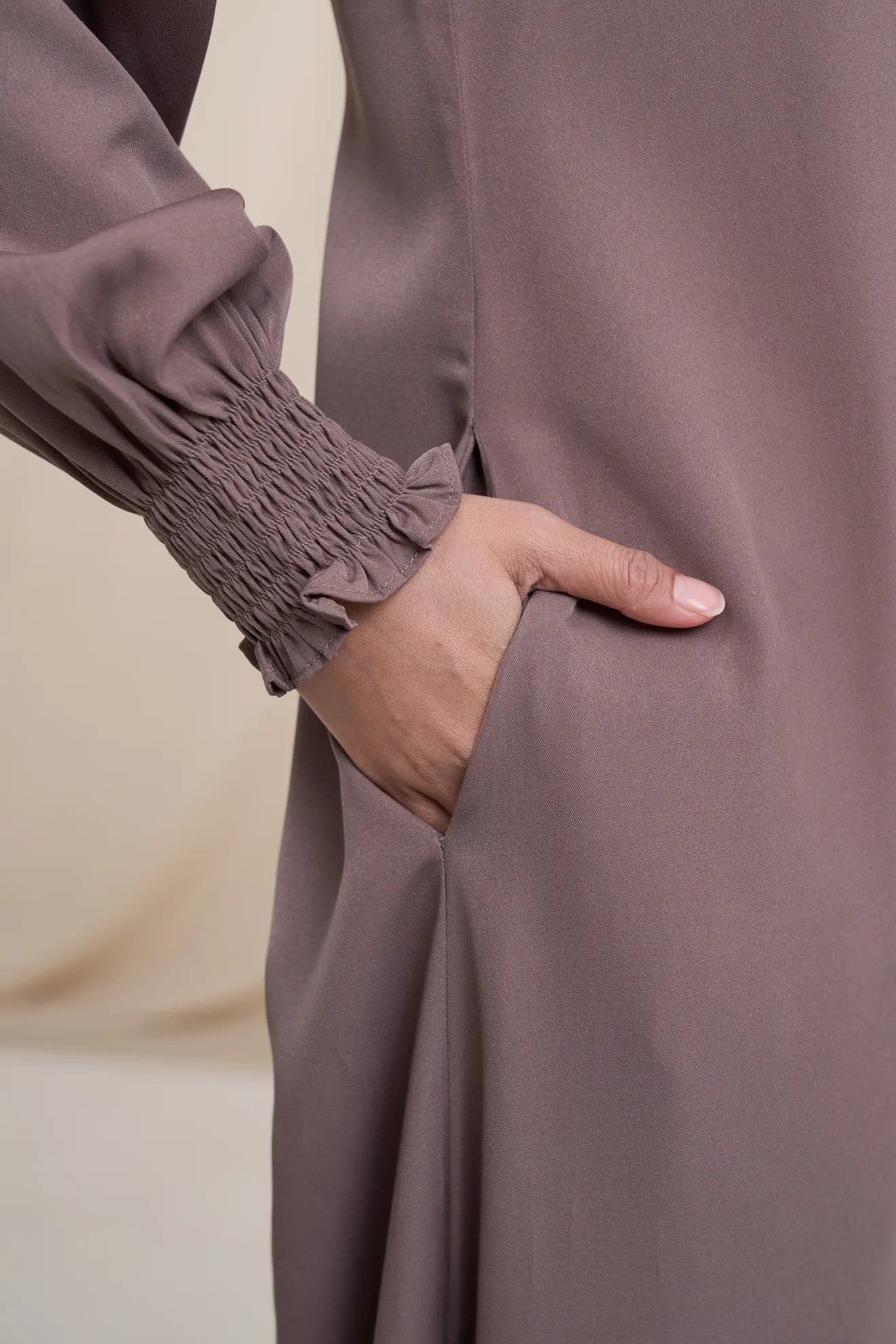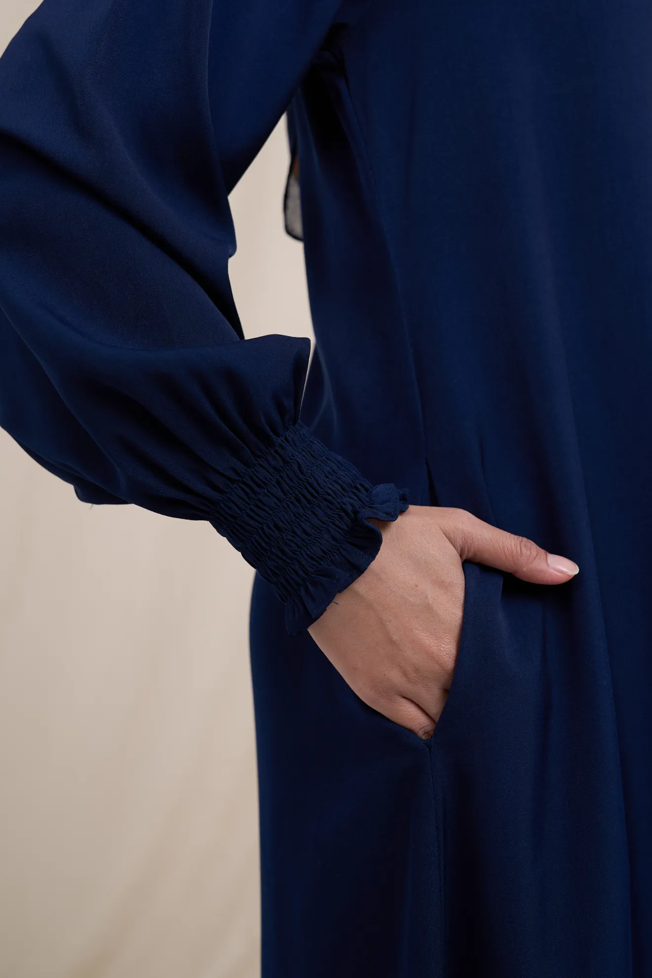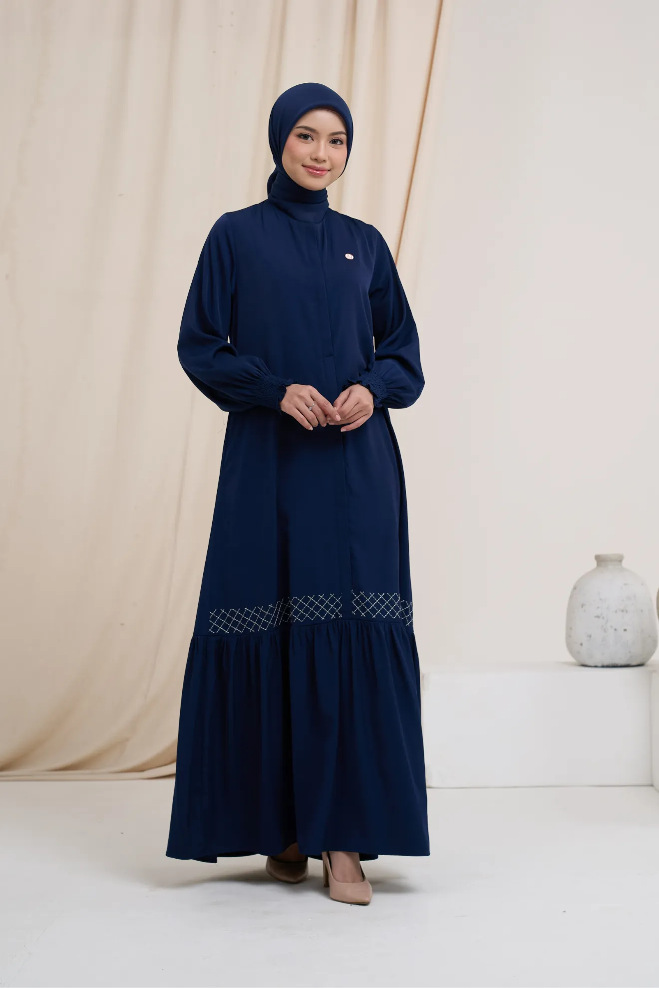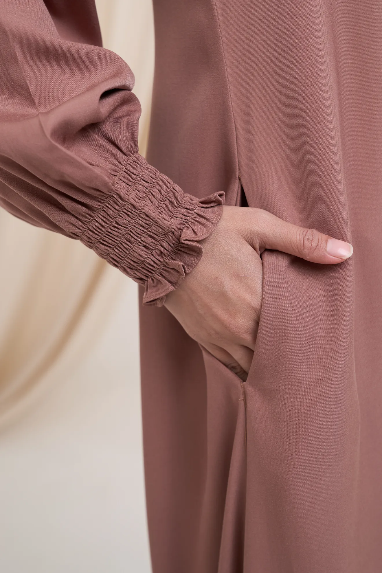 Kancing Depan Tersembunyi Variasi Kerut Variasi Bordir Lengan Karet Smock